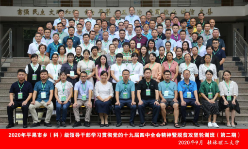 9月14日,由平果市委员会组织部主办,beats365(中国区)-唯一官方网站继续教育学院承办的“2020年平果市乡(科)级领导干部学习贯彻党的十九届四中全会精神暨第二期脱贫攻坚轮训班” 在教十楼10301教室顺利开班。