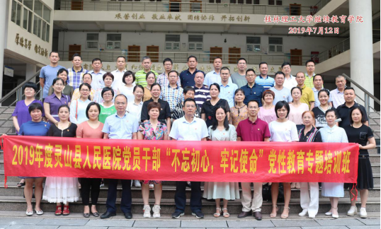 7月8日-12日,灵山县人民医院党员干部“不忘初心、牢记使命”党性教育专题培训班在我校举办。此次培训班共有50位灵山县人民医院党员干部参加。在为期5天的培训中,学员们将通过《“不忘初心、牢记使命”-习近平新时代中国特色社会主义思想解读》、《从中美贸易战看国际政治经济形势》、《全面加强党的建设,促进公立医院改革发展--关于加强公立医院党建工作意见的贯彻落实》等课程进行学习,培训期间还组织学员去兴安湘江战役纪念园、桂林廉政教育基地等地进行现场教学。