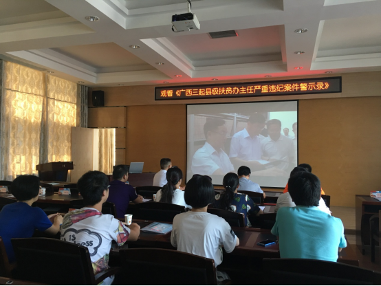 为全面深入推进学习贯彻习近平总书记关于党风廉政建设和反腐败斗争系列重要讲话精神,根据廉政教育活动周的安排,6月27日下午,我院全体党员在10309室集中观看了《广西三起县级扶贫办主任严重违纪案件警示录》专题片。