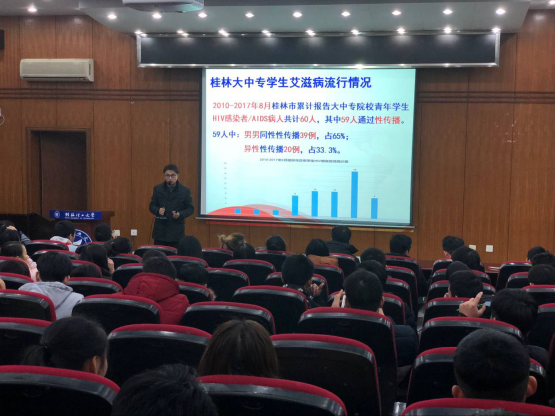 为普及艾滋病防治知识,增强学生防治艾滋病的能力和意识。2017年12月14日,我院邀请了桂林市卫生学校高级讲师王朴老师为全体师生举办了一场防艾知识讲座。