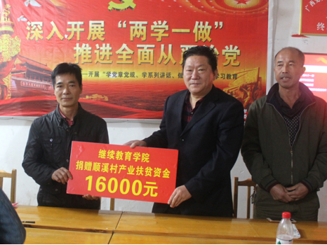 在顺溪村党支部会议室,我院和顺溪村党支部、村委会举行了简短的座谈。双方围绕一年来开展的扶贫工作进行了总结座谈。灌阳县黄关镇党委副书记、学校驻顺溪村第一书记李永伟、顺溪村党支部严景经书记、村委会伍玉明主任向大家介绍了顺溪村基本情况,感谢学院对顺溪村的帮助,对今年脱贫攻坚工作作了总结介绍。我院直属党支部书记、院长曹文献代表学院发言,并向顺溪村捐助了产业扶贫资金。