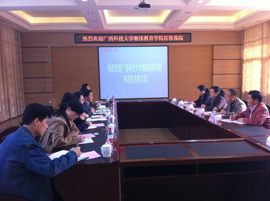 3月5日上午,广西师范学院继续教育学院院长王屹教授、副院长黄旭广一行5人来我院考察交流;3月6日上午,广西科技大学继续教育学院党总支书记廖奕、副院长杨胜、副院长甘建华一行5人来我院考察交流。我院曹文献院长及有关部门负责人与来访人员在教十楼三楼会议室进行了座谈。