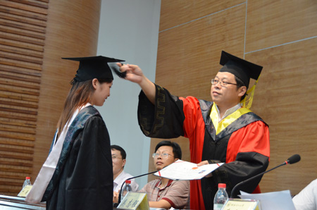 曹文献院长首先致毕业典礼开幕词。在欢快的背景音乐声中,获得学士学位和荣誉证书的各位优秀毕业生分别上台领取证书。