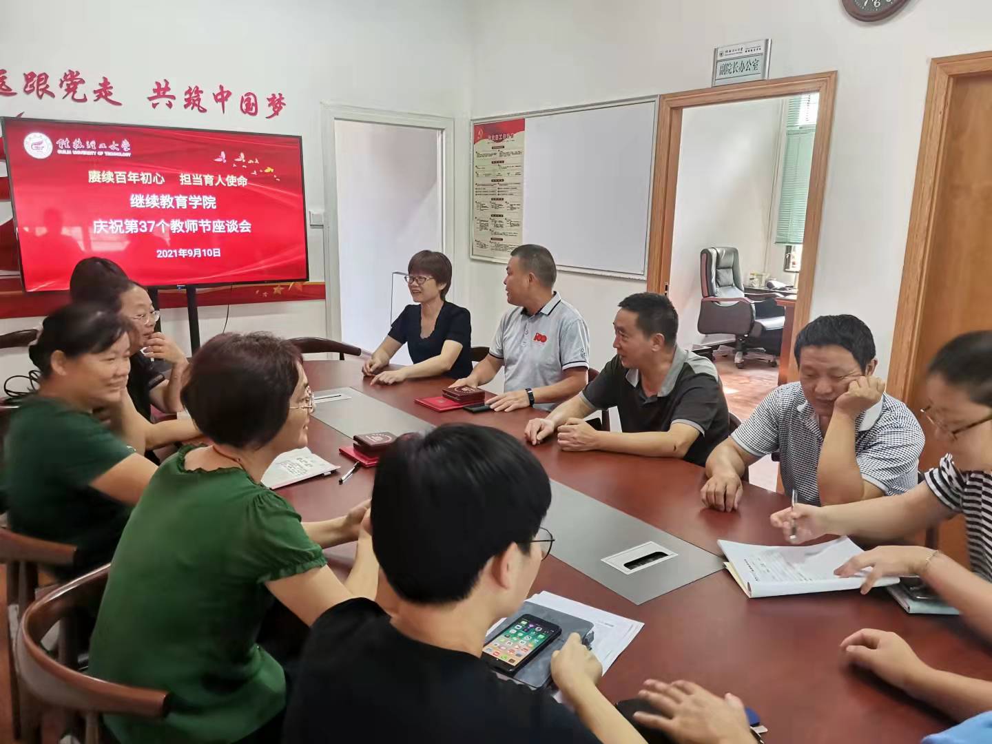 在全国第37个教师节来临之际,9月10日上午,学院专门组织召开以“赓续百年初心,担当育人使命”为主题的教师节座谈会。院长熊英、副院长王学军,以及我院受到学校“从教三十年”表彰的教师和部分教师参加了座谈会。