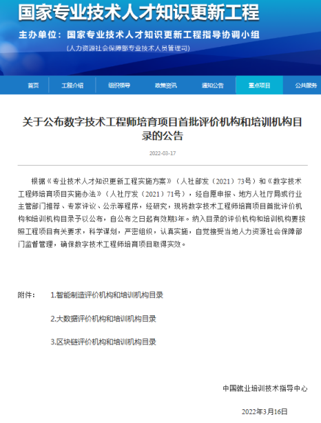 日前,国家人力资源社会保障部中国就业培训技术指导中心发布《关于公布数字技术工程师培育项目首批评价机构和培训机构目录的公告》,经区人社厅推荐、专家评议等程序,我校成功入选数字技术工程师“大数据”方向培训机构,成为广西首批具备面向全国开展数字技术工程师培训资质的唯一入围单位。