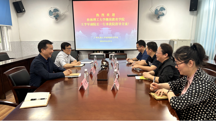 在广西民族大学继续教育学院,覃志和院长分享了民大在学历继续教育的一些经验做法。王学军副院长对民大百忙中抽时间传经送宝表示感谢,同时介绍了我校学历继续教育的基本情况。双方就学历继续教育管办分离、管理机制、人才培养方案修订、学科综合课程设置、线下教学、学校自主开发网络课程建设等工作进行了深入沟通。