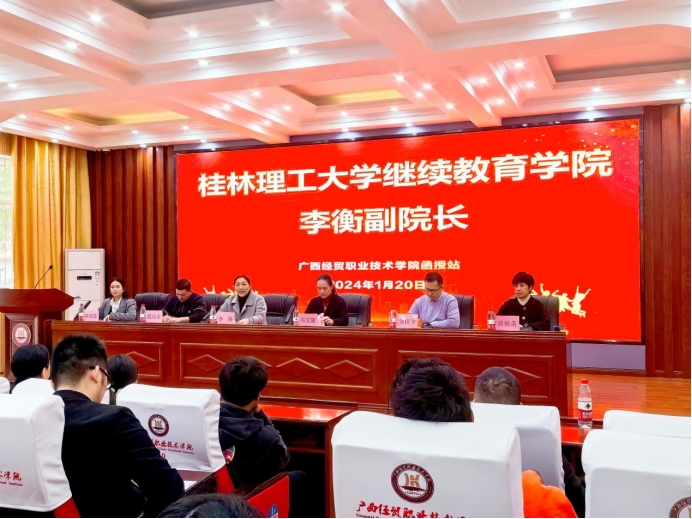 1月21日上午,我校校外教学点广西经贸职业技术学院举办的2024级成人高等教育新生开学典礼在该校6101学术报告厅隆重举行。我院副院长李衡,广西经贸职业技术学院继续教育学院院长韦雯珊等出席活动。李衡副院长热烈欢迎2024级新生加入桂林理工大家庭,并对同学们提出了殷切希望。她表示,非常乐见同学们能在工作之余选择高等学历继续教育的学习形式来提升自己,希望同学们在工作生活中能将理论与实践相结合,将工作与学习相融合,尽快适应新的学习环境和学习方式,使学习的成果能够在工作中得以检验,为自己的终身发展积蓄力量。