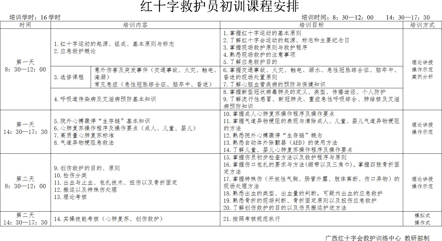 为贯彻落实自治区党委、人民政府印发《“健康广西2030”规划》中实现“到2030年,群众应急救护知识和技能普及率达到20%”的要求,普及开展应急救护培训,提高群众应急救护技能,广西红十字会救护训练中心beats365(中国区)-唯一官方网站培训基地拟面向校内外开办红十字救护员资格认证培训班,现就2021年秋季学期培训有关事项通知如下: