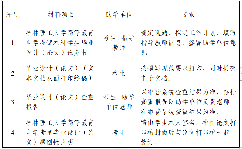 根据我校自学考试教学安排,2024年上半年自学考试本科毕业生将进入毕业设计(论文)环节。毕业设计(论文)工作是十分重要的教学、管理环节,各助学单位必须高度重视。为确保毕业设计(论文)工作按要求完成,现将有关要求通知如下: