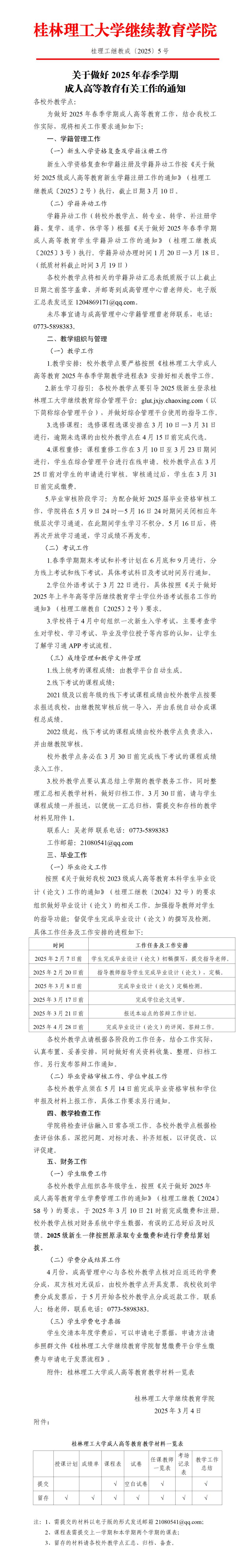 关于做好2025年春季学期成人高等教育有关工作的通知 发布者:成高管理中心 2025-03-04 已阅人次 (一审:吴佳 二审:林文钊 三审:李衡) 上一条:关于做好2025年春季学期成人高等教育课程重修工作的通知 下一条:beats365(中国区)-唯一官方网站继续教育学院征集历届校友信息公告 关注我们