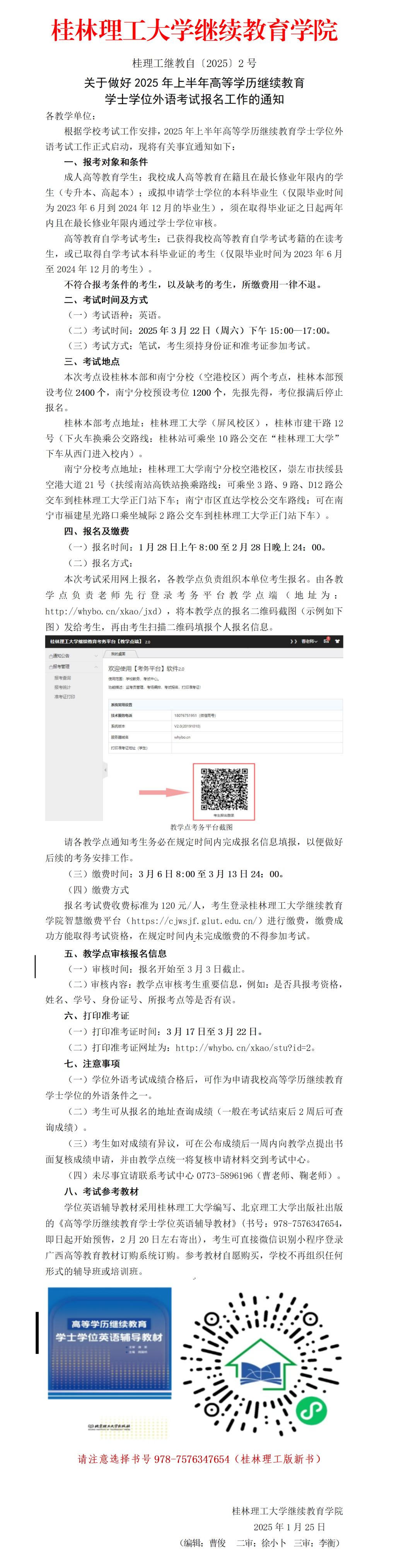 关于做好2025年上半年高等学历继续教育学士学位外语考试报名工作的通知 发布者:自考办(考试中心) 2025-01-25 已阅人次 上一条:2025年9月全国计算机等级考试beats365(中国区)-唯一官方网站考点报考通知 下一条:beats365(中国区)-唯一官方网站2025年3月全国计算机等级考试第二次报名公告 关注我们