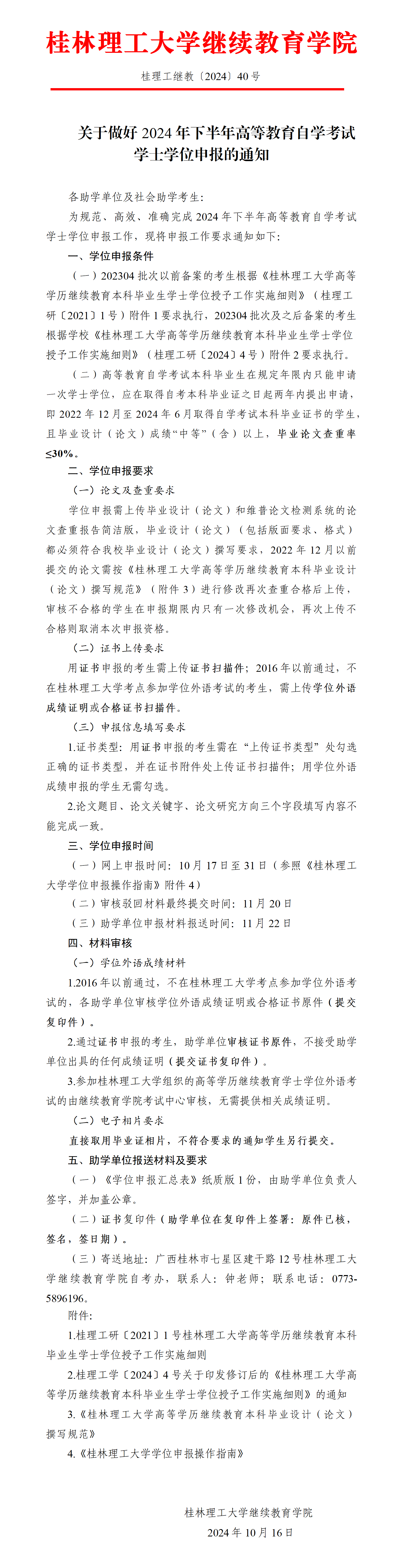 关于做好2024年下半年高等教育自学考试学士学位申报的通知 发布者:自考办(考试中心) 2024-10-16 已阅人次 (一审:钟小淘 二审:徐小卜 三审:李衡) 附件【附件1:桂理工研〔2021〕1 号beats365(中国区)-唯一官方网站高等学历继续教育本科毕业生学士学位授予工作实施细则.pdf】已下载次 附件【附件2:桂理工学〔2024〕4 号关于印发修订后的《beats365(中国区)-唯一官方网站高等学历继续教育本科毕业生学士学位授予工作实施细则》的通知.pdf】已下载次 附件【附件3:beats365(中国区)-唯一官方网站高等学历继续教育本科毕业设计(论文)撰写规范.doc】已下载次 附件【附件4:beats365(中国区)-唯一官方网站学位申报操作指南.docx】已下载次 上一条:关于做好2024年下半年高等教育自学考试毕业资格审定工作的通知 下一条:关于做好2024年下半年高等教育自学考试新生报名及备案相关工作的通知 关注我们