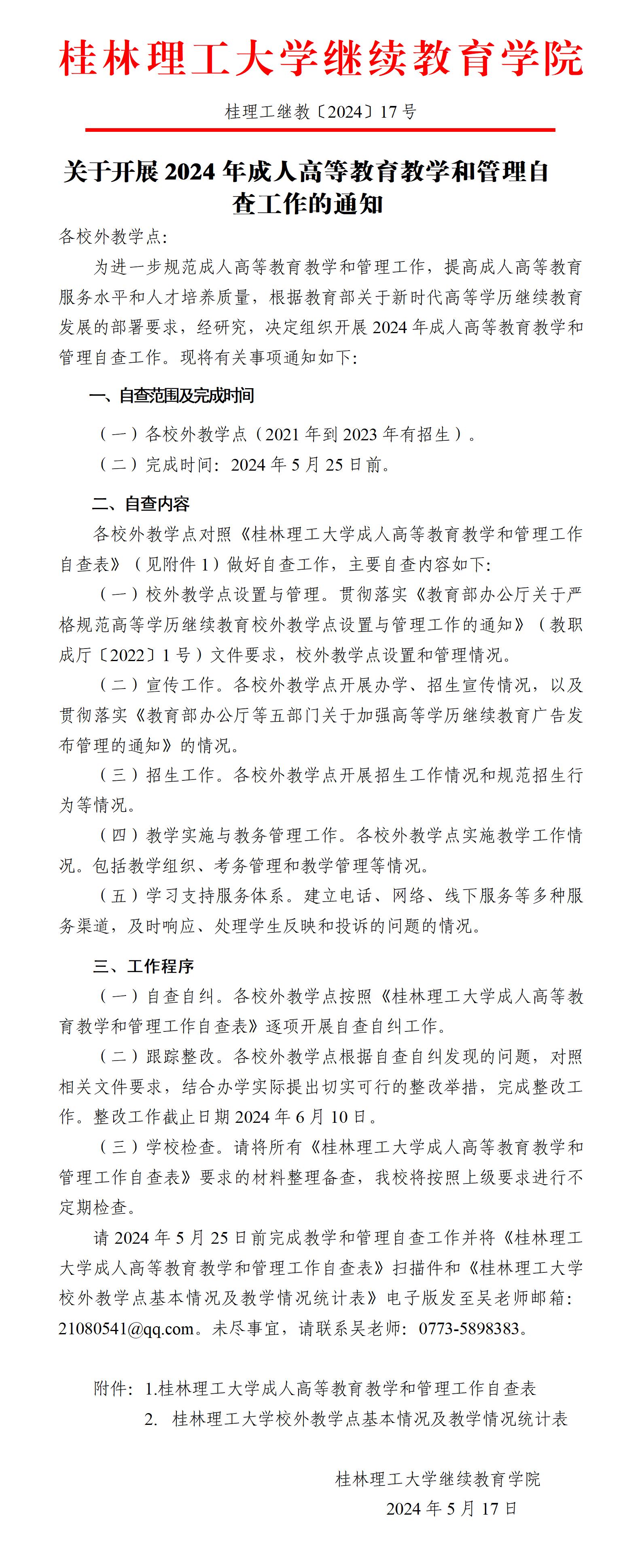 关于开展2024年成人高等教育教学和管理自查工作的通知 发布者:成高管理中心 2024-05-17 已阅人次 (一审:吴佳 二审:林文钊 三审:李衡) 附件【附件1:beats365(中国区)-唯一官方网站成人高等教育教学和管理工作自查表.docx】已下载次 附件【附件2:beats365(中国区)-唯一官方网站校外教学点基本情况及教学情况统计表.xls】已下载次 上一条:关于表彰beats365(中国区)-唯一官方网站2022—2023年度成人高等教育优秀校外教学点和优秀教学管理工作者的决定 下一条:beats365(中国区)-唯一官方网站继续教育学院2024届毕业设计(论文)答辩工作情况通报 关注我们