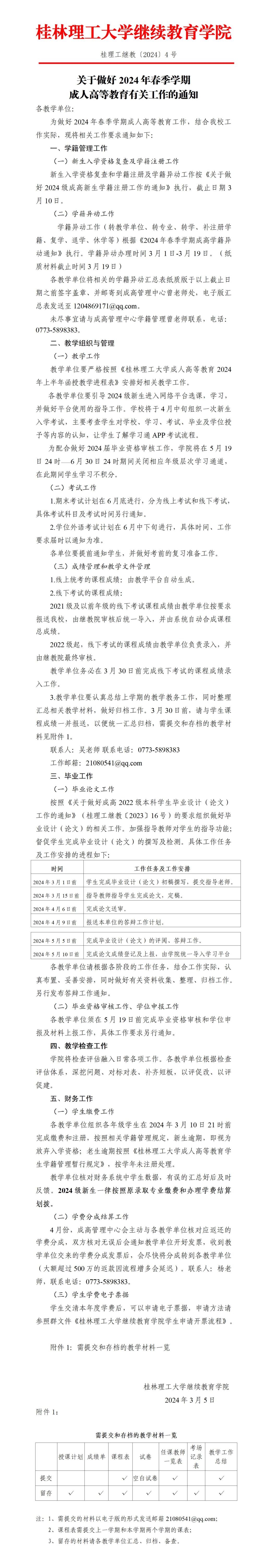 关于做好2024年春季学期 成人高等教育有关工作的通知 发布者:成高管理中心 2024-03-05 已阅人次 (一审:吴佳 二审:段伟才 三审:李衡) 上一条:关于做好2024年春季学期成人高等教育课程重修工作的通知 下一条:beats365(中国区)-唯一官方网站关于对第二批超过最长学习年限的成人高等教育学生拟作退学处理的公示 关注我们