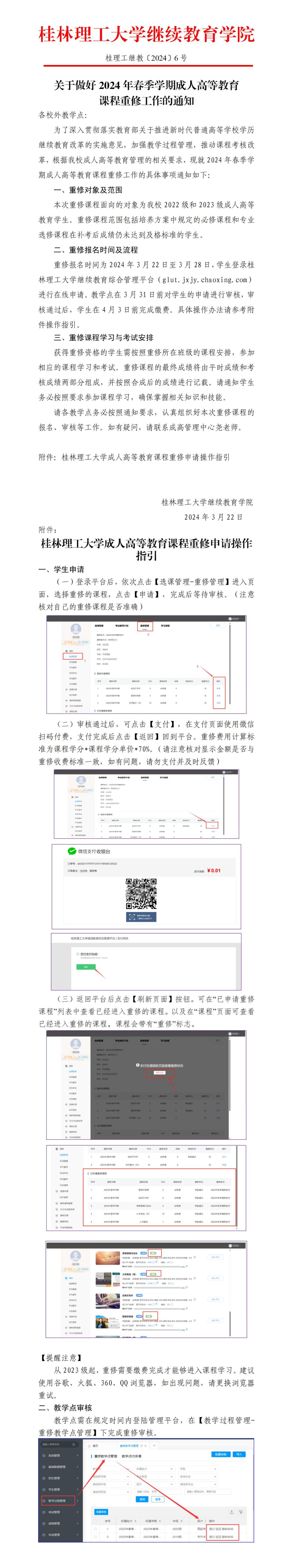 关于做好2024年春季学期成人高等教育课程重修工作的通知 发布者:成高管理中心 2024-03-22 已阅人次 (一审:尧田坤 二审:林文钊 三审:李衡) 上一条:关于做好2024届成人高等教育本科学生毕业设计(论文)答辩工作的通知 下一条:关于做好2024年春季学期 成人高等教育有关工作的通知 关注我们