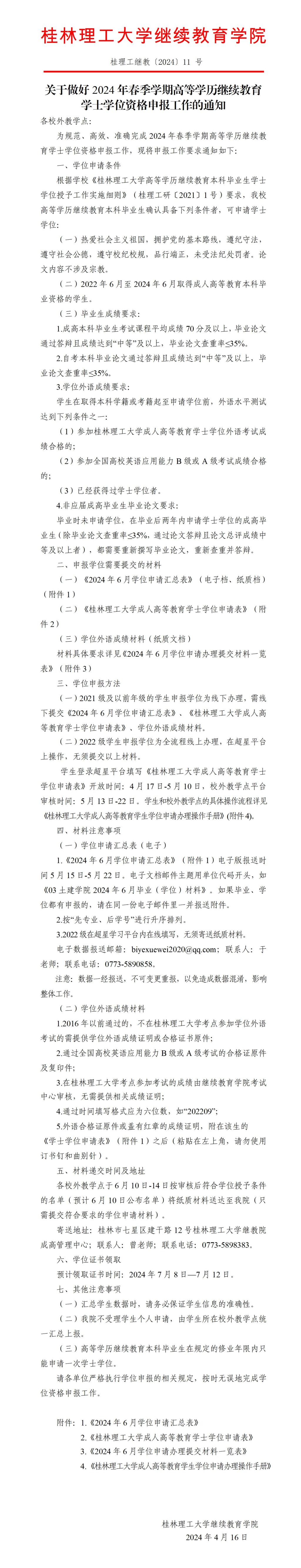 关于做好2024年春季学期高等学历继续教育学士学位资格申报工作的通知 发布者:成高管理中心 2024-04-16 已阅人次 (一审:于德新 二审:林文钊 三审:李衡) 上一条:关于印发修订后的《beats365(中国区)-唯一官方网站高等学历继续教育本科毕业生学士学位授予工作实施细则》的通知 下一条:关于做好2024年春季学期成人高等教育毕业生资格审核及毕业证办理工作的通知 关注我们