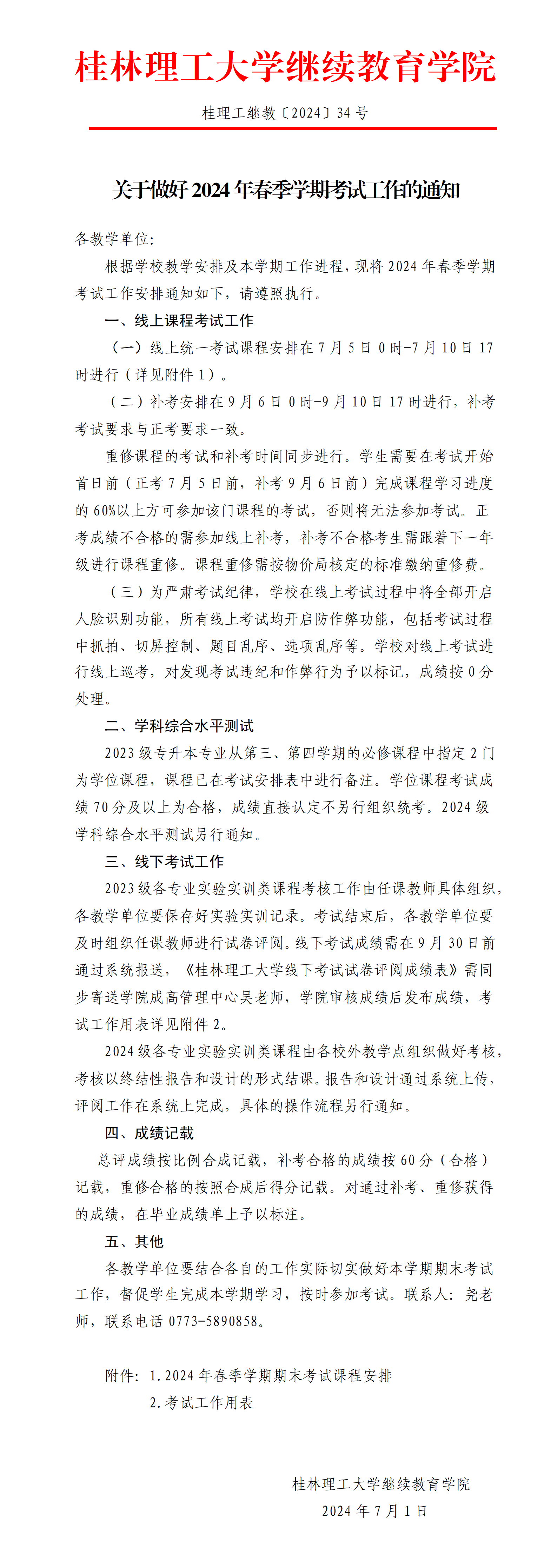 关于做好2024年春季学期考试工作的通知 发布者:成高管理中心 2024-07-01 已阅人次 (一审:尧田坤 二审:林文钊 三审:李衡) 上一条:关于做好 2024年秋季学期成人高等教育有关工作的通知 下一条:关于表彰beats365(中国区)-唯一官方网站高等学历继续教育2024年优秀毕业生的决定 关注我们