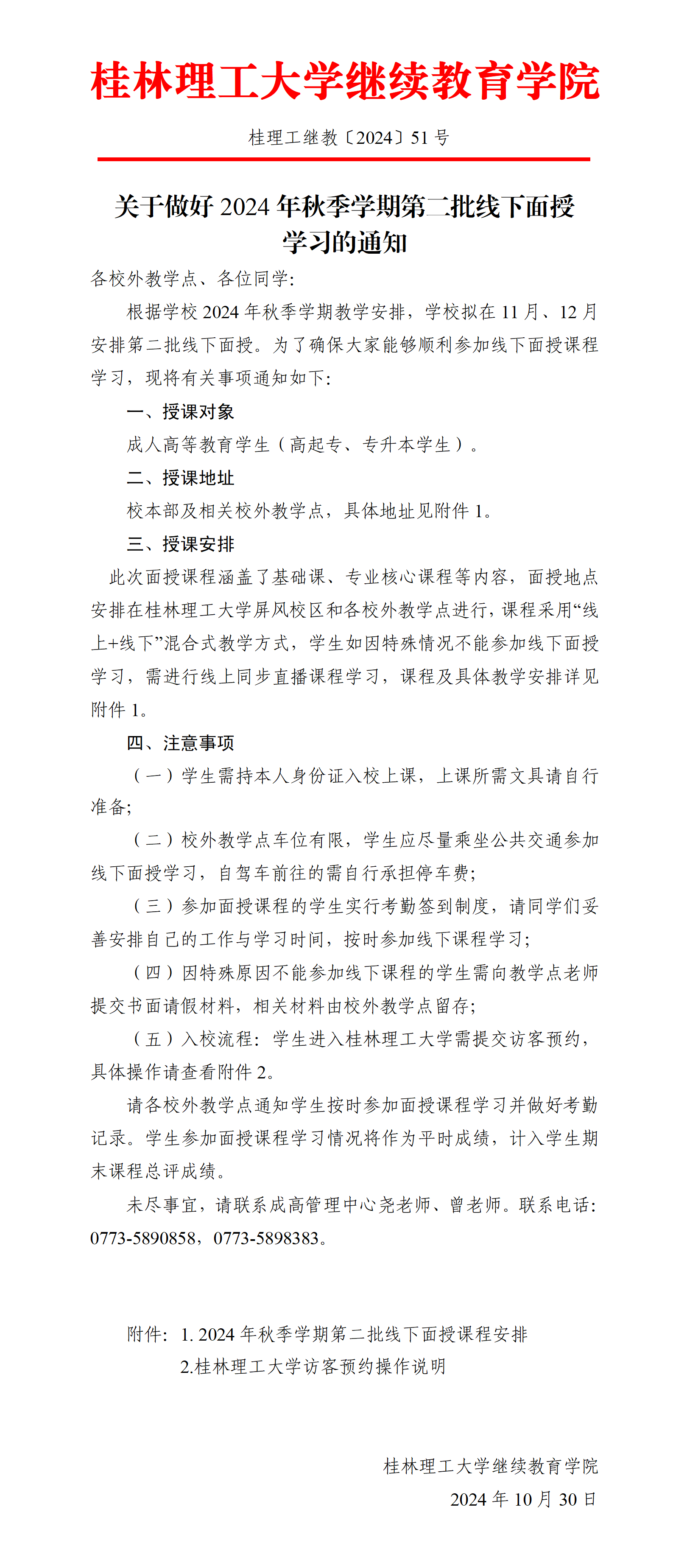 关于做好2024年秋季学期第二批线下面授学习的通知 发布者:成高管理中心 2024-10-30 已阅人次 (一审:曾婕 二审:林文钊 三审:李衡) 上一条:关于做好成人高等教育2024年秋季学期考试工作的通知 下一条:关于做好2024年秋季学期成人高等教育学士学位资格申报工作的通知 关注我们